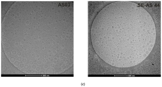 (a) Size and PdI for emulsions up to 10 weeks stored at 4 °C (blue), 25 °C (red) and 50 °C (green). (b) % Squalene and Tocopherol content for emulsions stored at 4 °C (blue), 25 °C (red) and 50 °C (green) for up to 2 weeks. The blue lines represent the acceptable limits of % content, i.e., 100% ± 20%. (c) Cryo-EM images of AS03 and SE-AS44 showing comparable droplet morphology. The oil droplets in AS03 are slightly bigger than SE-AS44, as expected.