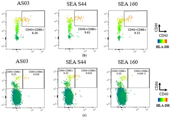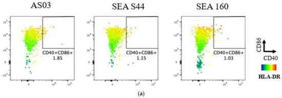Representative pseudo-color plots showing the tri-variate analysis of CD40 vs. CD86 markers with characterization of HLA-DR expression using heatmap analysis of human whole blood samples stimulated with adjuvants (AS03, SEA S44, and SEA160) with media-treated and ex vivo stained samples as negative controls. AS03, SEA S44, and SEA160-stimulated whole blood samples showed an increase in CD40, CD86, and HLA-DR markers compared to media-treated samples in monocytes (a), mDC (b), and neutrophils (c), indicating induction of an antigen-presentation role.
