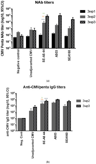 (a) Neutralizing antibody titers in serum obtained three weeks post-1st, 2nd and 3rd immunization against the CMV TB40 strain of virus. Each bar represents geometric mean titers (GMT) with 95% confidence interval (CI) from n = 10 animals per group. Statistical analysis was performed using one-way ANOVA followed by Tukey’s test to compare all groups with each other followed by Dunnett’s multiple comparisons test to compare each group with SE-AS44. Significant differences are marked on the graph only for 3wp2 titers. Comparison with CMV alone is shown in blue, with AS03 is shown in red, and with SEA160 is shown in green; ns = not significant, ** = p ˂ 0.005, *** = p ˂ 0.0005 . (b) Anti-CMV Penta IgG antibody titers in serum obtained three weeks post-1st, 2nd and 3rd immunization against the CMV TB40 strain of virus. Each bar represents geometric mean titers (GMT) with 95% confidence interval (CI) from n = 10 animals per group. Statistical analysis was performed using one-way ANOVA followed by Dunnett’s multiple comparisons test to compare differences between each group with SE-AS44. Significant differences are marked on the graph. Comparison with CMV alone is shown in blue, with AS03 is shown in red and with SEA160 is shown in green; ns = not significant, * = p ˂ 0.05, *** = p ˂ 0.0005.