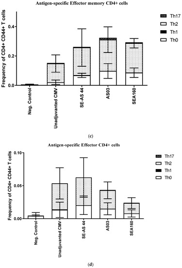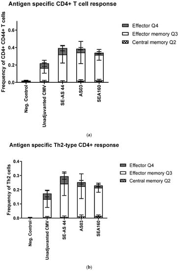 Finally, to determine cell-mediated immune responses, spleens from immunized mice 4 weeks post-3rd immunization were evaluated. We used the memory markers CD62L and CD127 to differentiate the CD4+ and CD8+ T cells into transitional, central memory, effector memory and effector cells. Prophylactic vaccines are designed to induce an efficient memory T-cell response against pathogens, which can eventually help the effector response [28,29]. Splenocytes were stained for both CD4+ and CD8+ T cells; however, the frequency of CD8+ T cells was very low, so only CD4+ T cell data was characterized. There were few to no transitional cells, the most frequent T cells were either effector or effector memory cells. Effector memory cells prevailed as the majority of CD4+ T cells when these were gated to look at the memory response (Figure 4a). There were no significant differences between the different adjuvant groups, although SE-AS44 showed higher total frequency of CD4+ T cells. As expected, when the CD4+ cells were gated into subtypes, Th2-subtype prevailed over others. The Th2-type response in mice is characteristic of emulsion adjuvants [10,14,30,31] and SE-AS44 showed the highest frequency of cells (Figure 4c). Although SE-AS44 shows slightly lower effector memory CD4+ T cells, our hypothesis is that this decrease in effector memory cells may have translated into a higher frequency of effector cells (Figure 4d).