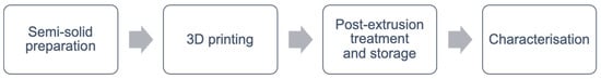 This study aims at developing a novel ODMT formulation suitable for paediatric use. This formulation will be tested with the model drug, carbamazepine (CBZ). CBZ is an anti-epileptic drug approved with a significant clinical application in treating generalised tonic-clonic and partial seizures in epilepsy and neuropathic pain [16]. With its low solubility and its narrow therapeutic window, CBZ is often observed with variable plasma concentration in paediatric patients [17,18,19]. Currently, CBZ is authorised with a target population among all age groups, although solid dosage forms such as tablets are not recommended for children below five. This study will investigate the feasibility of adapting ODMT formulation to CBZ, along with fabricating, characterising and assessing the quality attributes of produced CBZ ODMTs. This study will specifically look at producing ODMTs with semi-solid extrusion (SSE). SSE is one of the 3D printing techniques applicable for tablet production by accumulating pastes or gels, which will form into solid dosage forms after the semi-solid preparation hardens [20]. The process of SSE for printing tablets is illustrated in Figure 1.