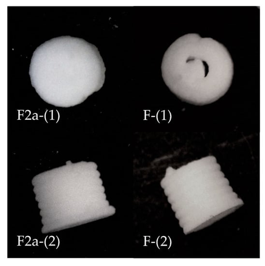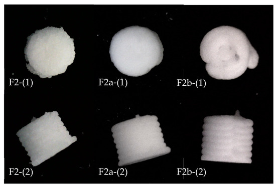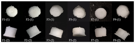 All minitablets from six formulations showed a cylinder shape as designed, with homogeneous white colour and obvious layers as shown in the images captured from the side. From the top view images, the concentric infill pattern could be seen in tablets in F1, F3 and F4, yet not in the other three formulations. All tablets showed irregular edges, and for F2, F3, F4 and F6, printed extrusion residues around the base layer were observed that could be due to the poor adhesion of the paste to the building plate or the paste strand was torn by the next layer [33].