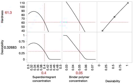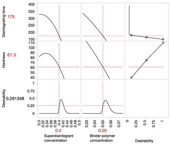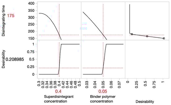 The DoE was completed by examining two responses, disintegrating time and hardness of printed ODMTs. The analysis of the design used a least squares fit model in JMP to predict the most suitable combination of two input factors to reach the best responses. Data were presented as prediction profilers, which can model the impact of crossed input variables, which may differ from separate observations made for each input factor [25].