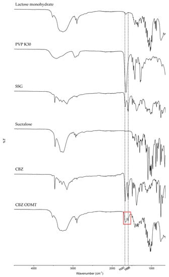 A Spectrum 100 spectrometer (Perkin Elmer, Waltham, MA, USA) was used for obtaining FTIR spectra for all raw materials, including each excipient and CBZ, and also for the drug-loaded ODMTs (crushed into fine powders with mortar and pestle). The spectra data were collected over the wavenumber from 650 to 4000 cm−1, with a total of 16 scans with a resolution of 1 cm−1. The data were processed using the Essential FTIR v3.10.016 software (Operant LLC, Monona, WI, USA) and were plotted using the OriginPro 2021 (OriginLab Corporation, Northampton, MA, USA).