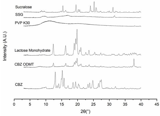 The XRD analysis data of CBZ ODMTs were plotted and compared with all raw materials in Figure 10. The diffraction pattern of the ODMT formulation was observed with sharp, distinctive peaks which indicated its crystalline form [39]. Meanwhile, a characteristic curve representing an amorphous state was also observed in the pattern, suggesting the physical form of the final formulation is partially crystalline and partially amorphous. Most of the peaks (within 10 to 35°) from the ODMT pattern were identical to the lactose monohydrate pattern, only with less intensity. A peak shift was observed at around 37°; since the major peaks from the excipients and the pure drug were shown, such a peak shift can be considered as experimental error [40].