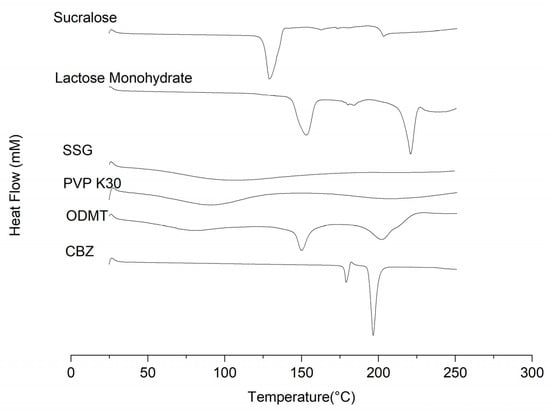 The DSC analysis data of the drug-loaded ODMTs were plotted and compared with all raw materials in Figure 11. All downward peaks in the graph represent endothermic processes of the material. The curve of dried ODMTs displayed a broader peak below 100 °C, possibly reflecting a process of water loss. However, this peak was not identical to the peak of PVP K30 or SSG. Such water loss could originate from the water added to the paste bound to the formulation. The result confirmed that the relatively low drug loading ratio mentioned before was due to water partially bound in the solid structure, increasing the tablet mass. Meanwhile, two other peaks were observed in the same curve. The peak around 150 °C can be aligned with the dehydration of the lactose [41]. The peak around 201 °C can cover the melting peaks of lactose monohydrate and CBZ. However, the actual peak shifted slightly from the peaks observed in raw materials. A possible explanation for such results was the part of the water bound to the structure, which formed intermolecular forces that affected the existing endothermic processes of excipients [42]. Overall, physical form analysis of raw ingredients and the formulation revealed good compatibility between the API and excipients.