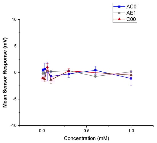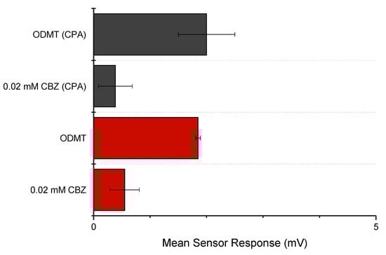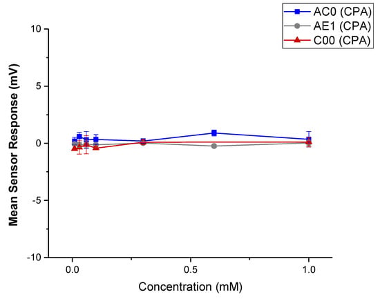 A series of CBZ solutions were tested with a number of sensors to see if the drug can be detected with any signals indicating a bitter taste. The mean responses of the three sensors were plotted in Figure 12 (initial taste) and Figure 13 (aftertaste, CPA). Within the tested concentration, the drug did not yield a response beyond 5 mV, and thus the drug was considered as undetectable for the three sensors used [43]. In other words, CBZ did not show a significant taste quality of bitterness or astringency [44]. CPA signals for the three sensors were also not detectable; therefore, it can be deduced that no bitterness or astringency would linger through as an aftertaste, suggesting that simple taste-masking strategies may be sufficient to ensure this ODMT is palatable.