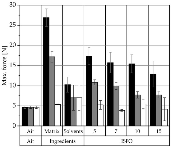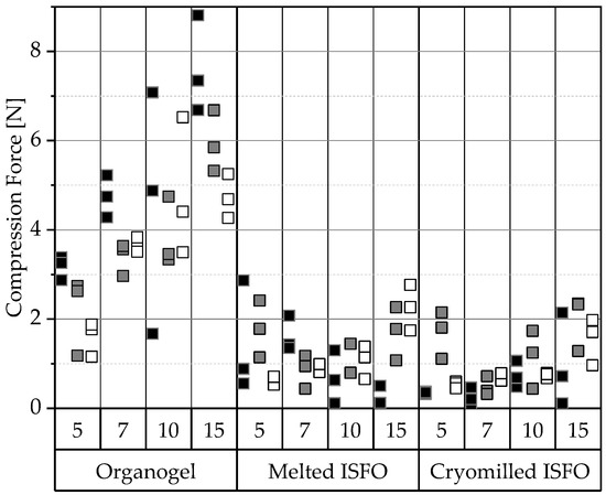 Comparing the tested ISFOs, the impact of the manufacturing method on the gel strength is negligible. PO forms the strongest organogel network, which cannot be seen for ISFOs. IPM-ISFOs exhibit the highest reproducibility, as indicated by the nearly perfect triangular force–displacement curves found in Figure A3 of the Appendix A. MCT-containing samples show small dips in their force–displacement curves, probably because they trap more air during solidification, resulting in uneven surfaces.