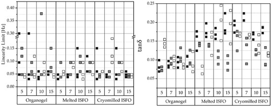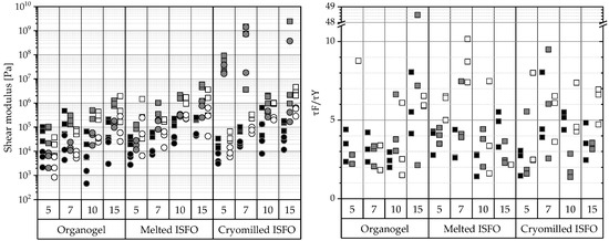 Sometimes gels tend to harden over time and their inner fluid separates—a process called syneresis. To avoid syneresis, the gel must remain flexible during storage. This can be seen in small ratios of below 10 or if , which is also evident in values above 0.1, whereby the higher the value the better. The results of the analysis are shown in the right half of Figure 3. According to the results, most organogels are expected to show syneresis, but most ISFOs show and there should be no syneresis in ISFOs, except for 5-melted-IPM-ISFO, the 10- and 15-melted-MCT-ISFO samples, and the 7- and 15-cryomilled-MCT-ISFO samples.