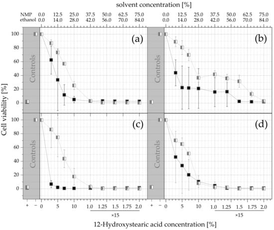 Due to the constant ratio of both compounds in the formulation, the mass of 12-HSA is proportional to the mass of NMP by a factor of 2.5 and to the mass of ethanol by a factor 2.8. NMP was much more toxic than ethanol in both cases, and 3T3 cells were more sensitive than NHDF cells, as supported by the IC50 values in Table 4.