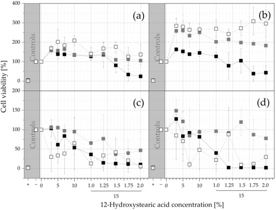 The toxicity of the ISFOs is due to the acute toxicity of the solvent and the long-term toxicity of the gel itself. Therefore, the cytotoxicity was evaluated with a concentration series of the solvent as a direct-contact test and an extraction series of the solidified gel according to the International Organization for Standardization (ISO) ISO 10993 recommendation. An illustration of the setup can be found in Figure A2 in the Appendix A. Pure medium without cells, ergo 200 µL of pure medium, was added to column 1 of the 96-well plate as a blank. Cells in medium were used as a negative control and cells stressed with 0.05% TritonTM X-100 solution (v/v) were used as a positive control in columns 2 and 3, respectively. Nine columns for varying samples were available. Each sample was prepared with increasing amounts of 12-HSA, starting with 3% to 15%. The selected concentration corresponded to an injection of 200 μL of gel in 800 μL of medium, so a drug extract ratio of 0.25 was used following the ratio proposed in part 12 of ISO 10993. Since gels are defined as semisolids containing less than 15% of gelator molecules [40], gelator concentrations higher than 15% were not investigated. Instead, the last four columns were prepared using a higher volume of gel (250, 300, 350, 400 μL) injected into the same volume of medium (800 µL), or in other words the drug extract ratio was increased (0.3125; 0.375; 0.4375; 0.5).