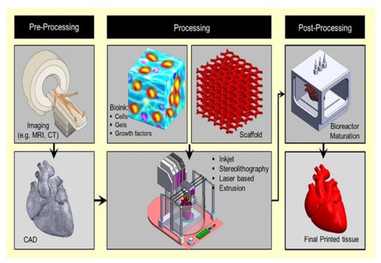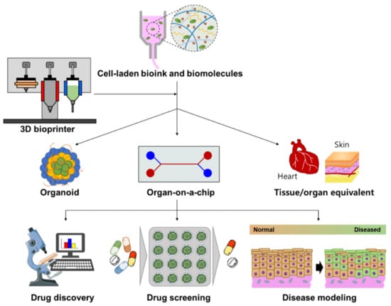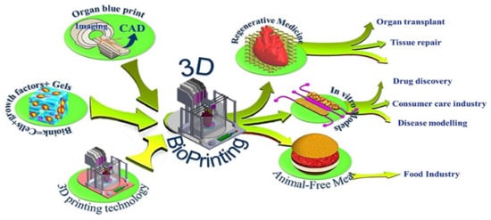 Numerous applications of 3D bio-printing. Reprinted with permission from [20]. Copyright 2021, MDPI. Distributed under Creative Commons Attribution—based license (CCBY 4.0).