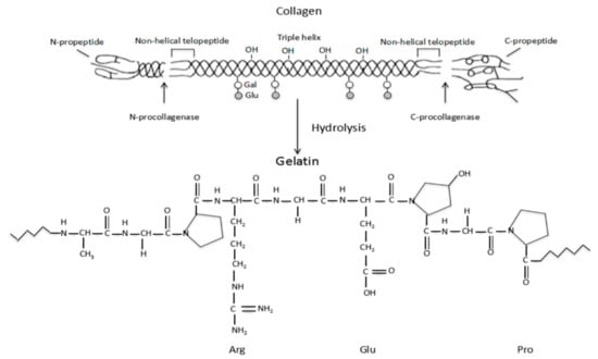 Schematic representation of the collagen hydrolysis to gelatin. Reprinted with permission from [46]. Copyright 2017, MDPI. Distributed under Creative Commons Attribution—based license (CCBY 4.0).