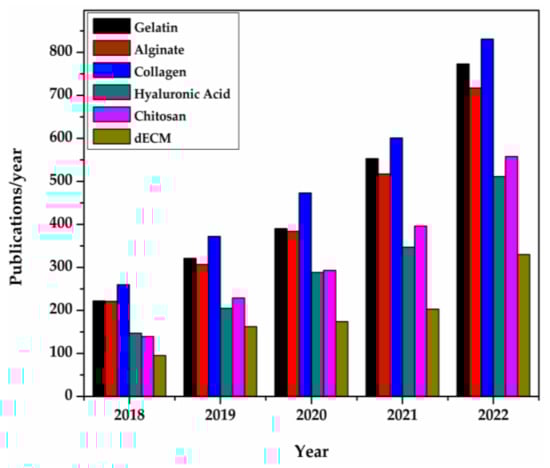 Natural polymer publication/year in 3D bio-printing for tissue engineering [101]. The bars represent the number of publications retrieved from Science Direct. The examined time interval was 2018–2022.