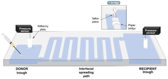 The use of PS for different drug delivery strategies has been explored by many researchers with different targets [10,11,12,13]. Apart from the suitability of PS composition to efficiently solubilise poorly water-soluble molecules [14], the main reason why this material improves the distribution of drugs over the respiratory surface has to do with its capability to rapidly spread along air–liquid interfaces. Once adsorbed into the interface, surfactant spreads interfacially due to surface tension gradients, from regions where the surface tension is low (high concentrations of PS) to regions with higher surface tension, following what are known as Marangoni flows [15,16,17,18]. When therapeutic molecules are combined with PS, this lipid mass transfer implies the transport of the molecules associated with it; this has been called “the interfacial delivery” [12]. This process has been recently studied by our group [12,19,20] and other researchers [21,22] by using various designs based on surface balances. To the best of our knowledge, most of the designs were based on the one proposed by Yu and Possmayer [23], where a donor surface balance is connected with an acceptor one by a hydrated paper bridge that serves as an interfacial link. It has been demonstrated that only a surfactant monolayer is transferred from the donor to the recipient trough [24], meaning that the surface-associated reservoirs are not able to cross the paper bridge. As a consequence, the contribution of these structures to the transfer of lipids and thus, the delivered molecules, has been mostly disregarded.