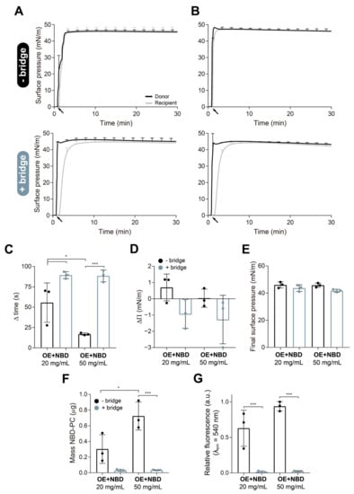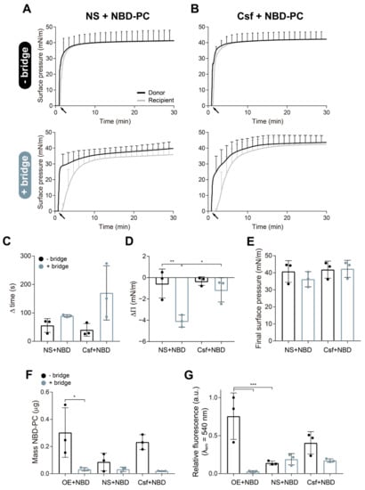 As revealed in Figure 3, similar results have been observed using different surfactant preparations. In these experiments, we evaluated the effect of the paper bridge in retaining some surfactant structures upon spreading of various surfactant formulations. We tested whole NS, a purified porcine surfactant constituted by a complex mixture of multi-layered and multi-vesicular structures, and Curosurf, a clinical surfactant reconstituted from the hydrophobic fraction obtained from minced porcine lungs and possessing a simpler structure, similar to that of the OE previously assayed [31]. Figure 3A,B shows the adsorption/spreading isotherms derived from the injection at the donor trough of 15 µL NS or Curosurf (20 mg/mL), all doped with 1% mol/mol NBD-PC to follow the spreading of the material to the recipient trough in the absence (upper panels) or in the presence (bottom panels) of the paper bridge. When any of the surfactant preparations tested were deposited at the donor interface, an instant increase in the surface pressure to values of 35–45 mN/m was detected at the donor compartment. A few seconds or minutes later, depending on the presence of the bridge, a rapid increase in the recipient surface pressure to values near the value measured in the donor trough was also observed. As described before, the bridge caused a delay of ~2 min in the increase in the pressure at the recipient balance (Figure 3C). This delay was less than a minute in the case of the experiments carried out without the bridge. Figure 3D presents the difference in the final surface pressure between the recipient and donor troughs either in the absence or in the presence of the bridge. Larger differences were always observed when the bridge was used. However, as observed also in Figure 2E, no significant differences were detected in the final recipient pressure comparing the absence and the presence of the bridge (Figure 3E). The amount of NBD-PC collected from the recipient interface revealed a reduced lipid transference to this trough in the presence of the bridge for the three materials tested (Figure 3F). We detected higher fluorescence of NBD-PC at the recipient subphase of experiments performed without the bridge (Figure 3G), as observed before.