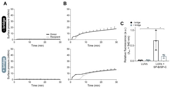 Interfacial spreading of lipidic or proteo-lipidic liposomes over the double-balance setup. Π-time isotherms of large unilamellar vesicles (LUVs) made of (A) DPPC:POPG (7:3, w/w) and (B) DPPC:POPG (7:3, w/w) + 2% (w/w) SP-B/SP-C (15 µL, 20 mg/mL) labelled with 1% (mol/mol) NBD-PC, both without (upper graphs) and with (bottom graphs) the paper bridge connecting the recipient trough with the rest of the system. (C) Relative fluorescence emission of the NBD-PC collected by aspiration from the recipient interface at the end of each experiment. Mean and standard deviation from three independent replicas are represented. One-way ANOVA (p = 0.004) followed by Tukey’s post-hoc test: (*) p < 0.05 and > 0.01, and (**) p ≤ 0.01 and > 0.005.