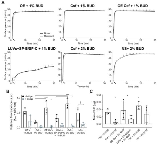 Interfacial vehiculization of budesonide (BUD) through pulmonary surfactant preparations. (A) Adsorption/spreading isotherms of aqueous suspensions of OE (top left), Csf (top middle), aqueous suspension of an OE of Csf (top right) and proteo-lipid LUVs (bottom left) combined with 1% (w/w with respect to total mass of phospholipids) BUD, and Csf (bottom middle), and NS (bottom right) in combination with 2% (w/w) BUD. Fifteen μL of each material at 20 mg/mL were deposited dropwise onto the donor interface (black arrows) and the changes in surface pressure were monitored during 30 min in both compartments. (B) Relative fluorescence emission of F-BUD (BUD) at λem = 650 nm at the recipient interfacial film collected by aspiration at the end of each experiment. Comparison of the fluorescence obtained for the different materials in experiments without (black bars) and with (blue bars) the bridge. (C) Comparison of the amount in µg of BUD transported by different materials to the recipient interface in experiments performed without the paper bridge. Data represents mean and standard deviation from at least three replicas. One-way ANOVA followed by Tukey’s post-hoc test: (B) p < 0.001; (C) p = 0.043. (§) p = 0.05, (*) p < 0.05 and > 0.01 and (***) p ≤ 0.005.
