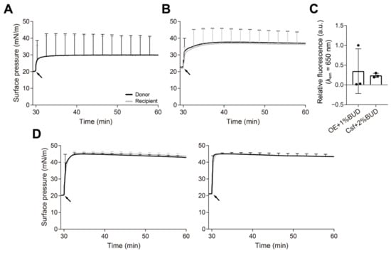 In an attempt to determine whether the surfactant reservoirs are able to insert into pre-existing interfacial films and spread along them, emulating what could occur in vivo when a potential exogenous PS would encounter the endogenous material, we performed experiments coating the interface with surfactant prior to the injection of the samples. To create a simple film coating the interface of the balance and avoid the formation of 3D structures, the OE in organic solvent was directly used to form the pre-existing film. Ten µL of OE (1 mg/mL) were applied dropwise onto the donor interface until the surface pressure in both compartments reached values of ~20 mN/m in order to coat the interface but not completely saturate it with surfactant. The organic solvent was allowed to evaporate during 10 min, and then 15 µL of the appropriate material were introduced into the donor subphase. After a further 30 min monitoring changes in surface pressure, the recipient interface and subphase were collected by aspiration. These experiments were carried out with fully interconnected compartments without using the paper bridge. Initially, we evaluated the vehiculization of BUD over an interface pre-coated with OE or Curosurf. As seen in Figure 6A,B, the injection of these two surfactant preparations produced an instant increase in the surface pressure of both compartments up to 30–40 mN/m, indicating that the injected material can adsorb and insert into the interface to complete saturation at equilibrium. Figure 6C shows the NileBlue-BUD fluorescence measured at the recipient interface. Even though there is a small fluorescence signal for the experiments with OE, this was only detected in one replicate out of three performed, and this is why the apparent standard deviation is high. No fluorescence was detected in any of the subphases. To determine whether increasing the surfactant concentration could affect the amount of fluorescence measured in the recipient trough, we performed experiments with OE doped with 1% NBD-PC at 20 mg/mL and 50 mg/mL. After coating the interface with a monolayer of OE, we injected 15 µL of OE + NBD-PC at the corresponding concentration at the donor subphase. Π-time isotherms show that OE at both concentrations was able to insert into the interfacial film and produce a surface pressure increase detected in both compartments (Figure 6D). No significant differences were observed in the surface pressure values obtained after the injection of OE at 20 mg/mL or 50 mg/mL. However, after the collection of the recipient interfaces and subphases from these experiments, we still could not detect any NBD-PC signal, even in the samples injected at 50 mg/mL.