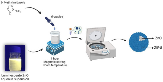 Figure 1 shows a schematic illustration of the developed material synthesis. After collecting the powder sample, luminescence remained when excited in a 365 nm lamp. The luminescence of ZnO is well-known in the literature. ZnO NPs are luminescent due to their quantum confinement [18]. As demonstrated in Figure 1, after ZIF-8 formation, the ZnO NPs remain luminescent. This result shows that the size of the ZnO NPs does not increase or barely increases in size, which is a very relevant result, since the size of the nanoparticles has already been shown to influence the antibacterial activity, and the smaller the nanoparticles are, the greater the activity is [19,20,21].