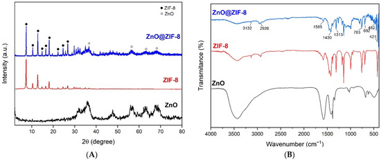 XRD patterns of ZnO NPs, ZIF-8 NPs, and ZnO@ZIF-8 NPs (A); FTIR spectra of ZIF-8 and ZnO@ZIF-8 NPs (B).
