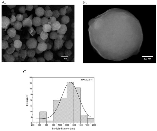 SEM images (A,B) and particle size distribution (C) of ZnO@ZIF-8 particles.