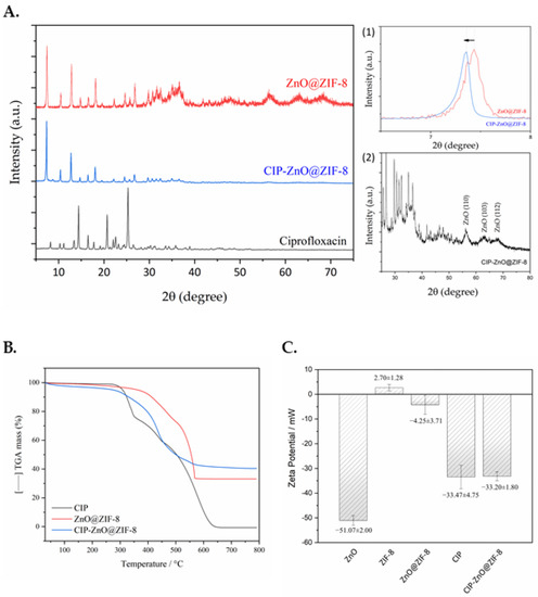 XRD analysis of CIP-ZnO@ZIF-8 after incorporation assays (A), with shift peak identification (A1) and identification of ZnO after incorporation (A2); TGA analyses of CIP, ZnO@ZIF-8, and CIP-ZnO@ZIF-8 (B); Zeta potential measurements for ZnO, ZIF-8, ZnO@ZIF-8, CIP, and CIP-ZnO@ZIF-8 NPs (n = 3) (C).