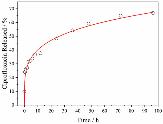 Profile of CIP release from ZnO@ZIF-8 into PBS solution at pH 7.4, at 37 °C. The data were fit to the Korsmeyer–Peppas equation, as indicated by the red line.