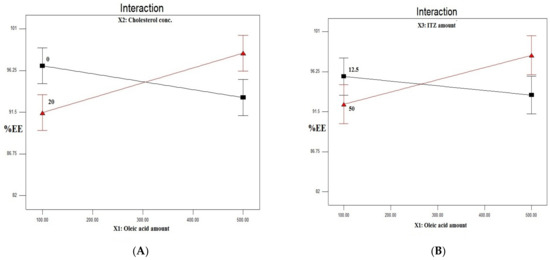There was an observed significant difference (p = 0.0009) in the interaction of oleic acid and cholesterol concentration. Figure 1A shows the interaction effect of the oleic acid amount and the cholesterol concentration on the %EE of ITZ in the prepared ITZ-loaded ufasomes. In the absence of cholesterol, there was a significant decrease in the %EE with the increase of the oleic acid amount. This could be attributed to the decrease in the molar ratio of the ITZ to the oleic acid, or the increase in the oleic acid to ITZ ratio. These results were shared with several scientists [25,47]. In their study on oleic acid vesicles for the topical delivery of fluconazole, Zakir et al. [48] stated that the mean entrapment efficiency of their developed vesicles increased with the increase in the molar quantity of fluconazole up to a 7:3 oleic acid to fluconazole ratio.