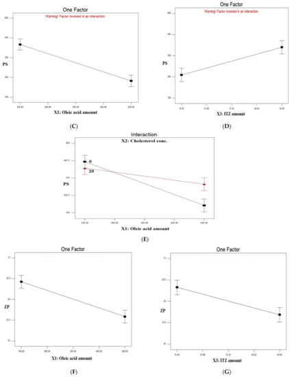 Line chart showing the effect of: (A) oleic acid amount–cholesterol concentration interaction (A,B) on %EE of ITZ, (B) oleic acid amount–drug amount interaction (A–C) on %EE of ITZ, (C) oleic acid amount (X1) on the PS of ITZ-loaded ufasomes, (D) drug amount (X3) on the PS of the ITZ-loaded ufasomes, (E) oleic acid amount–cholesterol concentration interaction (A,B) on the PS of ITZ-loaded ufasomes, (F) oleic acid amount (X1) on the ZP of ITZ-loaded ufasomes, and (G) drug amount (X3) on the ZP of ITZ-loaded ufasomes. Abbreviations: ITZ: itraconazole, %EE: percentage encapsulation efficiency, PS: particle size, ZP: zeta potential.
