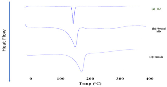 The thermal properties of the pure ITZ, a physical mixture of the optimized formula (mixed at the ratio in the optimized formula), and the optimized lyophilized formula were assessed using DSC (DSC822e, Mettler-Toledo International Inc., Columbus, OH, USA). The optimized formula was converted to the lyophilized powder form prior to scanning, via freezing at −20 °C, followed by freeze-drying for 24 h in a freeze dryer (Novalyphe-NL 500; Savant Instruments Corp., Hicksville, NY, USA) until the complete sublimation of all solvents [27,33].