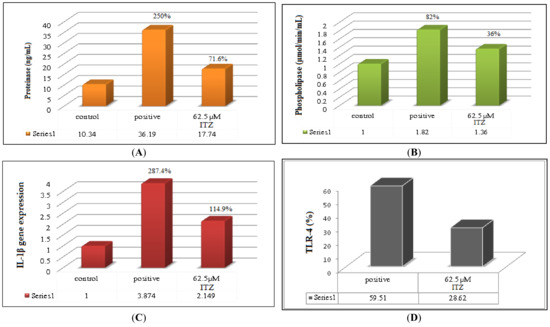 The antigen activation of toll-like receptors TLR-4 was achieved in vitro by stimulating fibroblast cells to produce cytokines by Candida-fibroblast cell culture [39]. Then the stimulated cells were fixed by using BD Cytofix/Cytoperm™ solution, followed by the permeabilization of the fixed cells by washing them two times in 1× BD Perm/Wash buffer (e.g., 1 mL/wash for staining in tubes and 250 µL/wash final volume for staining in microwell plates). A concentration of 10× BD Perm/Wash buffer was diluted in distilled H2O to make a 1× solution prior to use. The staining of intracellular cytokines was performed by wash cells two times with 1× BD Perm/Wash buffer (1 mL/wash for staining in tubes) and 250 µL/wash final volume for staining in microwell plates of the three groups—MIC of ITZ-loaded ufasomes F9 with Candida-fibroblast cell culture, Candida fibroblast cell culture (as positive control) and fibroblast cell culture (as negative control)—and resuspended in a staining buffer prior to flow cytometric analysis using a FACS Callibur™ (BD Immunocytometry Systems, USA) and CellQuest software (BD Biosciences-USA).