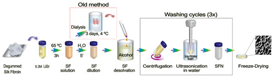 When the dissolved SF—in either 9.3 M LiBr [34] or Ajisawa’s solvent system [38]—was poured into an excess of a polar organic solvent, such as methanol, a milky white suspension of protein nanoparticles immediately appeared. While SF is maintained in the solution, peptidic chains are present in a random coil conformation due to multiple interactions of the side chains of the fibroin with the salt ions and the water molecules. It has been previously discussed how a fast replacement of their solvation sphere by an anti-solvent, such as methanol, induces the rapid folding of the peptide chains towards a more stable β-sheet assembly [39]. Although the classical methods of SF regeneration in the form of nanoparticles achieved by pouring an aqueous SF solution into an excess of a polar organic solvent are time-consuming due to the long dialysis step [1,9], it has generally been considered an essential stage of the process because it is routinely applied in other preparations of silk biomaterials [22]. However, taking into account our previous research with SF regenerated from an ionic liquid solution [15], where the dialysis step was not implemented, we proposed here the same methodology for SFN preparation. Thus, the SF chains should be able to reconstitute the hydrogen bonds network and thus change from a random coil structure to the highly ordered β-sheet conformation in the solid particles. In order to achieve this desolvation more efficiently, a previous stage of dilution of the SF solution was introduced, according to the previously published results of Lammel et al. (2010), who showed that lower concentrations of SF produce smaller particles [39]. This shortcut in the preparation of the nanoparticles, avoiding the dialysis step, is shown in Figure 1.