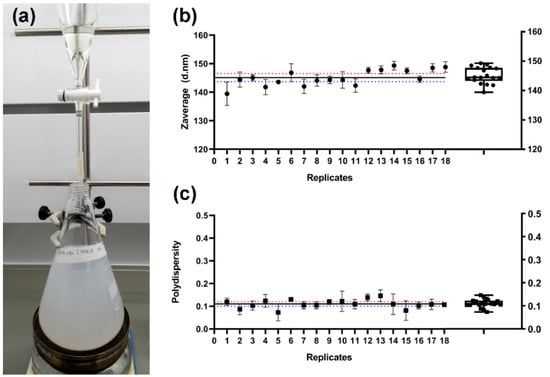 Preparation of the silk fibroin nanoparticles. (a) Photograph of the SF desolvation in methanol. (b,c) Values of the hydrodynamic characteristics of the prepared SFN (six replicates/batch) presented as mean ± SD of three independent measurements. (b) Zave (diameter in nm). (c) Polydispersity. Blue and red dotted lines represent the lower and upper 95% of the confidence interval (CI) of the mean, respectively. The black line represents the mean of all values (n = 18). Box and whiskers plot (10–90 percentile) is also included.