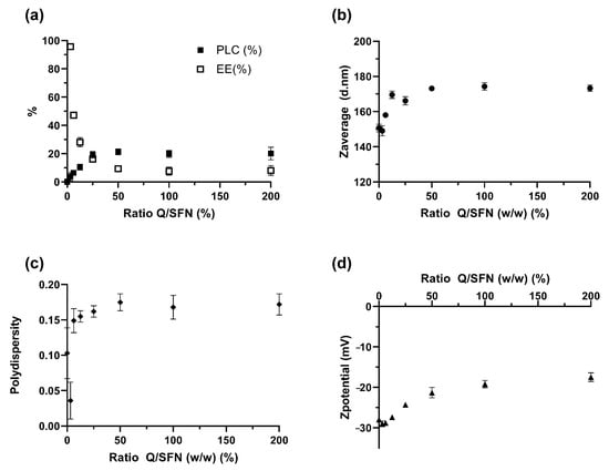 As shown in Figure 3a, the PLC values increased with the increment in the ratio Q/SFN. While the increment was roughly linear at lower ratios, it reached a plateau above the 1:4 ratio, which showed a PLC of 19.31 ± 2.35% and an EE of 16.17 ± 1.56%. Higher values did not produce further improvement in the loading parameters (i.e., higher %PLC and %EE). The hydrodynamic characteristics of the different loaded nanoparticles in this experiment were consistent with the PLC behavior (Figure 3). The diameters (Z-average) of SFN-Q displayed a rapid increase with an increment in the ratio Q/SFN up to the 1:8 ratio (12.5% in weight), which presented a diameter of ~170 nm. Higher ratios of Q/SFN were not translated into a proportional increase in size. On the contrary, a plateau was reached showing that the maximum loading of SFN-Q was reached. The polydispersity (PdI) and ζ values also varied with the ratio Q/SFN. PdI showed a parallel behavior increasing with the increment of the PLC loading.