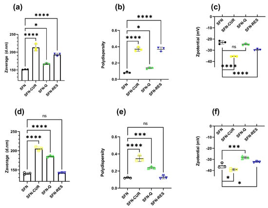 Hydrodynamic parameters of the aqueous suspensions of the SFN-PPh as prepared (a–c) and after the sterilization with γ-irradiation (2.5 kGy) (d–f). p-values were calculated using the two-way ANOVA test (considering p < 0.05 significant), followed by a Dunnet’s post hoc analysis, and are represented as * p < 0.05; *** p < 0.001; **** p < 0.0001.