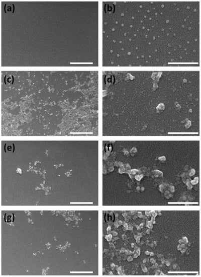 FESEM images of the nanoparticles used for the biological tests at different magnifications: SFN (a,b, as controls), SFN-CUR (c,d), SFN-Q (e,f) and SFN-RES (g,h). Scale bars 2 μm (a,c,e,g) or 400 nm (b,d,f,h).