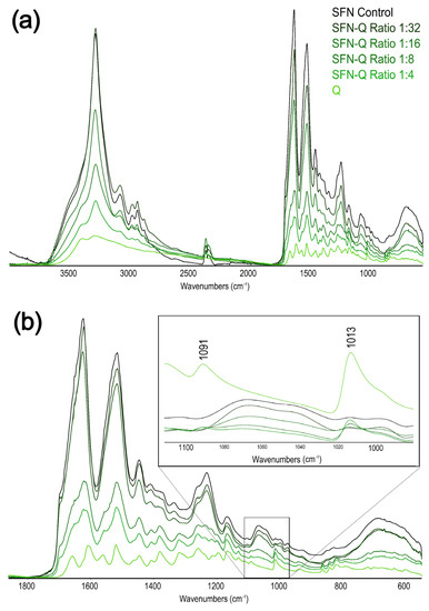 ATR-FTIR spectra of the prepared SFN-Q at different Q/SFN ratios. (a) Full spectra. (b) Region 1800–600 cm−1 of the spectra with an inset of the region 1750–100 cm−1 highlighting the quercetin signals.