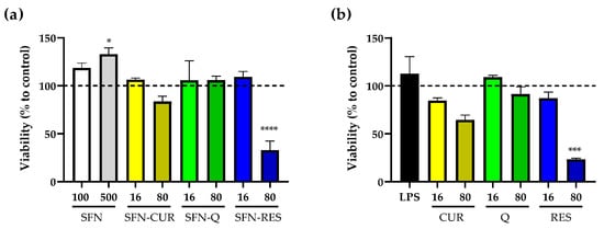 Effect of SFN-PPh and free PPh on the cell viability of human macrophage HL-60 differentiated cells measured by MTT assays (n = 3, three independent experiments performed in triplicate). (a) Cell viability in the presence of 100 or 500 µg·mL−1 of nanoparticles, equivalent to 16 or 80 µg·mL−1 of CUR, Q and RES according PLC. (b) Cell viability of HL-60 cells treated with free PPh (CUR, Q and RES) at the equivalent concentrations (16 and 80 µg·mL−1). Data are presented as % of cell viability ± SE of LPS-stimulated (0.1 µg·mL−1) HL-60 differentiated cells. Statistical differences were calculated using the two-way ANOVA test, followed by Dunnet’s post hoc analysis and represented as * p < 0.05; *** p < 0.001; **** p < 0.0001. All data presented are normalized compared to untreated cells (dash line, 100% cell viability). LPS, lipopolysaccharide; SFN, silk fibroin nanoparticles; PPh, polyphenol; SFN-CUR, SFN-curcumin loaded; SFN-Q, SFN-quercetin loaded; SFN-RES, SFN-resveratrol loaded; CUR, curcumin; Q, quercetin; RES, resveratrol.