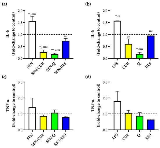 Furthermore, both free Q and SFN-Q significantly reduced IL-6 release compared to the untreated control. Interestingly, in contrast to free CUR (Figure 8b), SFN-CUR was also able to significantly further reduce the production of IL-6 compared to the untreated cells (p = 0.001, Figure 8a), reaching a level of inhibition like that observed with SFN-Q, although no differences were observed between free and SFN-Q treatment (Table S4). This suggests that the use of SFN might result in an enhanced cellular uptake and bioavailability of the Q. On the other hand, none of the applied treatments showed a remarkable effect on TNF-α production. Furthermore, although the production of this cytokine following LPS treatment showed a rising trend, it did not reach statistical significance (Figure 8c,d). Nonetheless, all treatments (free and loaded compounds) showed a trend of getting TNF-α concentrations down to basal levels, and a further mild but not significant decrease in TNF-α was observed between LPS alone and LPS plus SFN-RES or free RES-treated cells (Figure 8c,d).