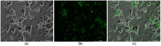 Human macrophage-like HL-60 cells after 24 h of the treatment with SFN-CUR at 0.1 mg·mL−1: (a) white field; (b) green channel; (c) merge. Scale bar = 100 μm.