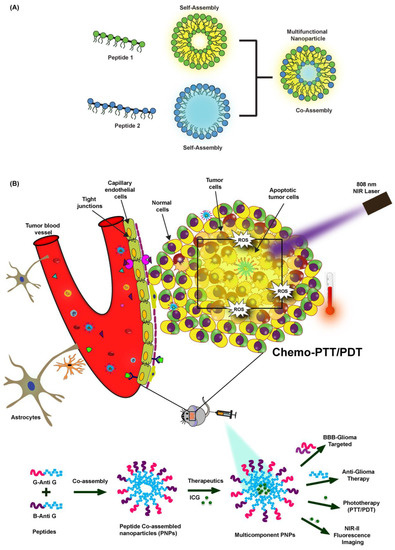 (A) Illustration showing peptide-based co-assembled multifunctional nanoparticles. (B) Scheme showing the synthesis of blood brain barrier (BBB)-glioma homing and anti-glioma chimeric peptides-based co-assembled nanoparticles (PNPs) loaded with indocyanine green (ICG) for combinatorial fluorescence-based imaging along with enabling the targeted chemo-phototherapy of glioma.