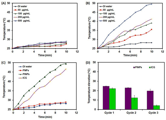 The photothermal efficiency of the PNPs and PINPs (0–500 μg/mL) were studied using a NIR laser (Aimil Technologies, Delhi, India) as described previously [12,13]. The details are provided in the Supplementary Materials.