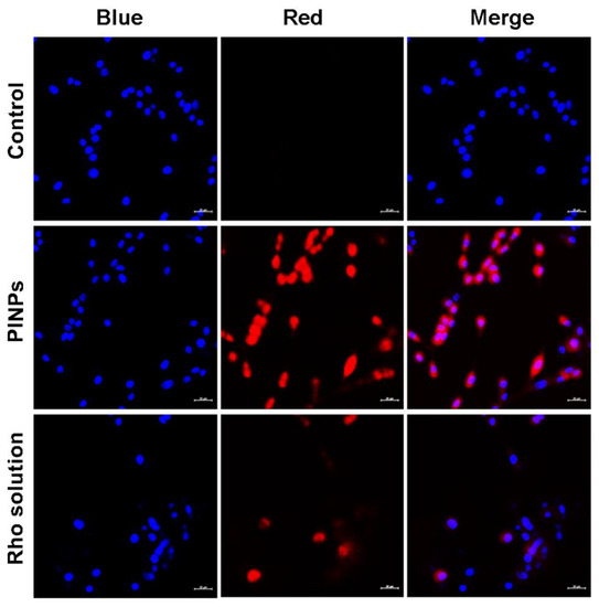 Confocal micrographs depicting cellular internalization of rhodamine 6G (Rho)-loaded PINPs after 2 h of co-incubation with C6 cells. Blue color: Hoechst (staining nucleus); Red color: Rho (staining cytoplasm). Scale bar: 20 µm.