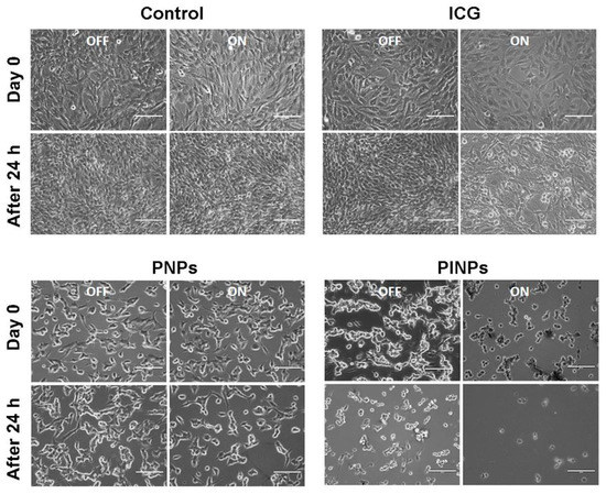 The localized collaborative chemo-phototoxicity of PINPs, in contrast to PNPs, was studied and then visualized using C6 cells. In short, to assess the thermal ablation effect, C6 cells (50,000/well in 6-well dishes) were seeded and cultured in complete media and they were treated with different formulations (100 μg/mL, for 30 min). The used complete growth media containing the formulations was then swapped with new phenol-free media without FBS. For a combined chemo-phototoxicity analysis, the corresponding wells containing cells were exposed to a NIR-808 laser for ~10 min, incubated for an additional 30 min, and subsequently imaged under a brightfield microscope (Olympus BX53; Tokyo, Japan) [12,13].