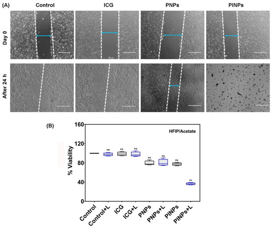 (A) Scratch assay showing migration of C6 cells after being incubated with PINPs, ICG, PNPs, and control untreated cells after laser irradiation. The dotted lines mark the areas lacking cells and blue color arrows represents the gap width. (magnification: ×400). (B) Collaborative chemo-PTT/PDT toxicity of PINPs (5 µg/mL) in C6 cells before and after laser irradiation. Results are presented as median and quartiles (min. to max.) in quadruplicate. The bar inside the box represents the median. Statistical analysis was carried out using a Kruskal–Wallis test followed by a Dunn’s post hoc test. Asterisk (*) refers to the statistically significant difference between the control untreated cells vs. other groups. (** p < 0.01; ns = non-significant).