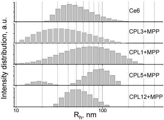 In aqueous solutions (PBS), all the obtained [copolymer]-MPP systems form nanoparticles, the average hydrodynamic sizes of which vary from 27 to 95 nm (Figure 2 and Table 2). The reference PS—trisodium salt of chlorine e6 (Ce6) also forms aggregates in water (Figure 2 and Table 2), which is in good agreement with the literature data [45,46].