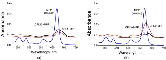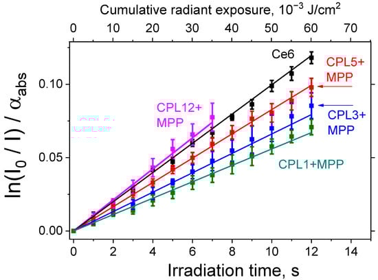 In Figure 6a,b, this effect is illustrated by the example of CPL5 + MPP; however, it is also observed for all the studied NPs. We assume that the observed effect is associated with the ability of MPP to gradually transfer from polymeric NPs to the membranes of lecithin liposomes, in which the DPBF probe is located. If light irradiation is performed immediately after mixing the NPs and DPBF solutions, then the MPP does not have time to transfer from NPs into liposomes. However, if the MPP has enough time to transfer from NPs to liposomes, then we observe MPP a in much less aggregated form, as could be concluded from the absorbance of the MPP Q-band region. The observed effect is well-known in the literature—many works discuss the release of the active compound from amphiphilic NPs into cell membranes [15]. This effect is also used for the creation of liposomes loaded with a hydrophobic compound (native C60 fullerene) due to its transition from amphiphilic NPs to “empty” liposomes in an aqueous solution [49].