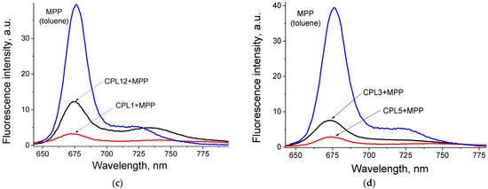 Second, disaggregation of MPP should increase the fluorescence signal from MPP. To confirm that, we mixed a water solution of CPL5 + MPP with a solution of “empty” liposomes (without a DPBF probe). The MPP in the obtained mixture demonstrated a gradual change of absorbance in the Q-band region (Figure 6c) and a sharp increase (by ~50 times) of fluorescence signal after incubation for 3 h (Figure 6d).