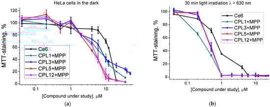 According to the results of the dark toxicity test, all NPs with MPP have either a comparable (IC50 = 12.1 μM for CPL3 + MPP) or 2–2.5 times higher cytotoxicity values (IC50 = 4.9 μM for CPL5 + MPP and 5.2 μM for CPL12 + MPP) than that for reference Ce6 (IC50 = 13.5 µM) (Table 2 and Figure 5a). We believe that it could be related to MPP’s much more pronounced hydrophobic properties compared to Ce6.